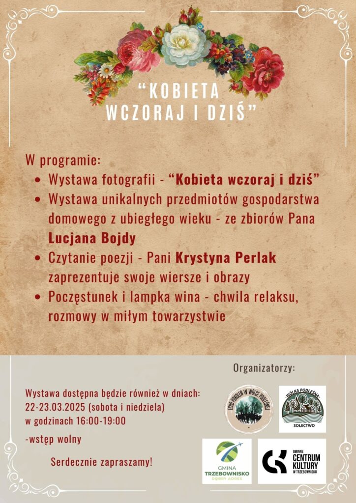Serdecznie zapraszamy na wystawę "Kobieta wczoraj i dziś"! Przenieście się z nami w czasie, odkrywając historię kobiet poprzez stare fotografie i dawne przedmioty z gospodarstwa domowego. Wystawa zostanie wzbogacona o współczesne obrazy i poezję, które dodadzą jej wyjątkowego charakteru. Dołączcie do nas i spędźcie niezapomniany czas, odkrywając przeszłość i teraźniejszość w jednym miejscu.